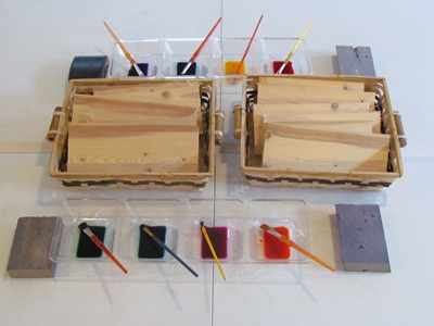 For this process, we set out scrap wood, sanding sponges, and Colorations Liquid Watercolor Paint. You could probably use any kind of paint for painting wood but the watercolor paint lets the children still see the grain (lines) of the wood while still adding color. The children sanded their rough edges (which really were not that rough) and then painted all over their boards any way they wished…